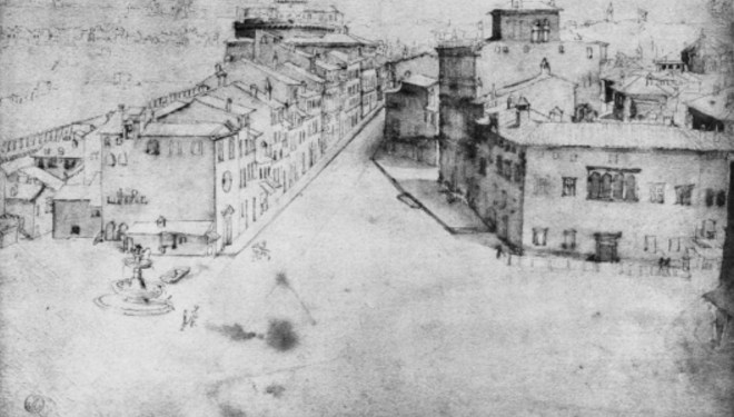 View (ca. 1561-1564) of the old Borgo Alessandrino or Nuovo, looking east from S Peter’s, by G. A. Dosio (Uffizi 2580A). The Palazzo del Priorato (of the Knights of Malta, also known as Palazzo S Martinello) is shown at front to the right. Dosio’s view seems to be unique; the Palazzo del Priorato was demolished in 1667 to make way for Bernini’s Colonnade, and the sketch itself was lost in 1939. Credit: P. N. Ferri, in Rassegna d’ Arte 4 (1904) 92.