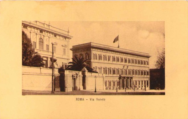 This postcard view of the Via Veneto shows at right one of the two Villini of the Palazzo Piombino; the Hotel Exclesior is in the background at left.