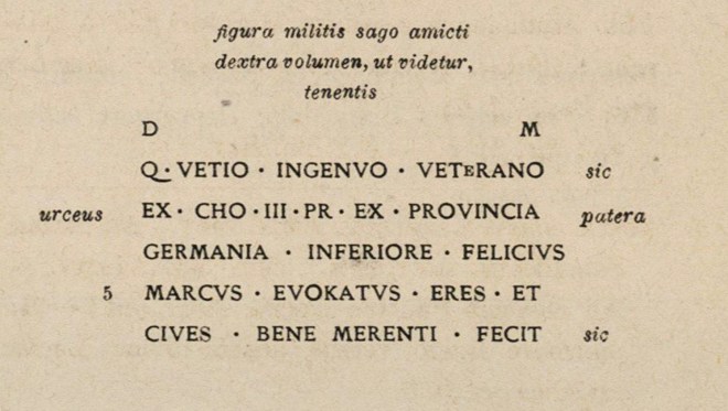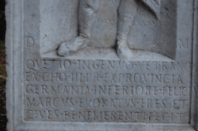 The dedicator of the monument, as its more or less elegantly carved inscription tells us, was one Felicius Marcus, a long-serving military man (he terms himself evokatus, and thus had seen at least 16 years of service) from the province of Germania Inferior. That province took in territory on the western bank of the Rhine that includes today’s Luxembourg, as well as parts of Germany, Holland, and Belgium. Vetius had made Felicius, who proudly announces on the stone his Roman citizenship, his heir. The form of the dedication is reasonably conventional, which allowed Manfred Clauss to date the monument to the years “200-250 CE” (Epigraphica 35 [1973] 92, cf. 78).
