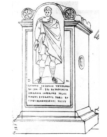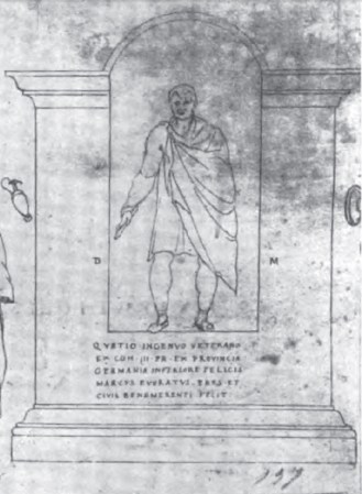 Sketch of Vetius monument (now in Stockholm) by J.J. Boissard. Reproduced in B. Palma (ed.), I Marmi Ludovisi 1.4 (1983) p. 21 fig. 23, with note “oggi disperso”. Bossiard evidently had difficulty in making out the honorand’s name (‘Quintio’ for ‘Q. Vetio’), as well as the dedicator’s status (‘praes.’ for the ‘eres’, i.e., ‘heres’ on the stone). Vetius here is also clean-shaven.