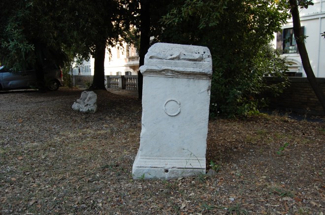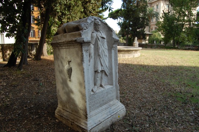 Well, here’s some good news. The Vetius tomb monument is very much extant, and today displayed prominently in the garden directly off the SE wing of the Casino Aurora. It has evidently been there for some time; for instance, a photo inventory of the Casino grounds from ca. 1995 (for which I thank Tatiana Caltabellotta from the Amministrazione Boncompagni Ludovisi) shows it placed precisely where it sits today. It would take some doing to figure out how the altar eluded detection in the meticulous survey that resulted in the Palma volumes of the mid-1980s—and in a sense, it hardly matters. What seems certain is that the monument hasn’t traveled more than a couple of hundred yards in almost the last 400 years.