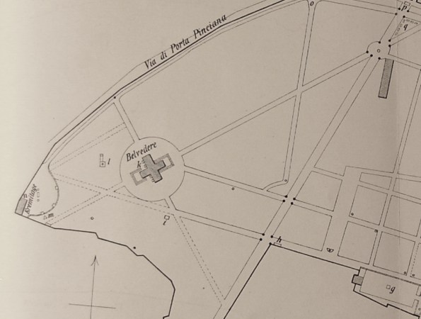 Detail of Villa Ludovisi map in T. Schreiber (1880), showing location of the ‘Hermitage’ (letter “n”, at extreme left) and the Vetius monument (note tiny marks directly to the right of the Hermitage caption). The Casino Aurora (here marked as ‘Belvedere’) lies not quite 100 meters to the east.