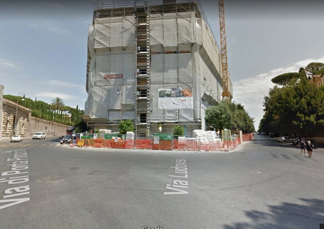 The location of the Villa Ludovisi’s ‘Hermitage’—the largo where today the Via di Porta Pinciana meets Via Ludovisi—as it appeared in July 2016. The building under wraps is the Hotel Eden (built 1889 on ex-Boncompagni Ludovisi property).