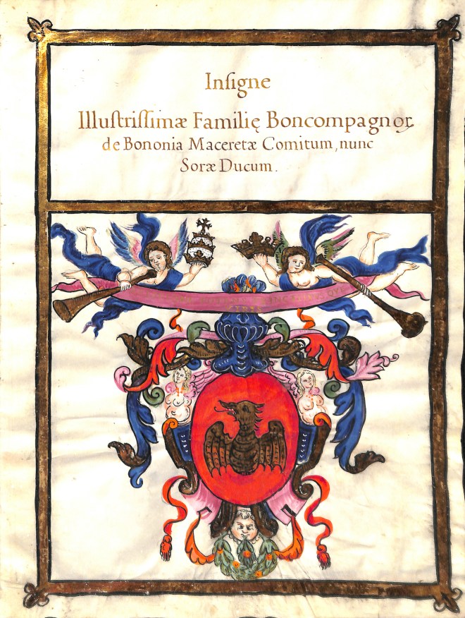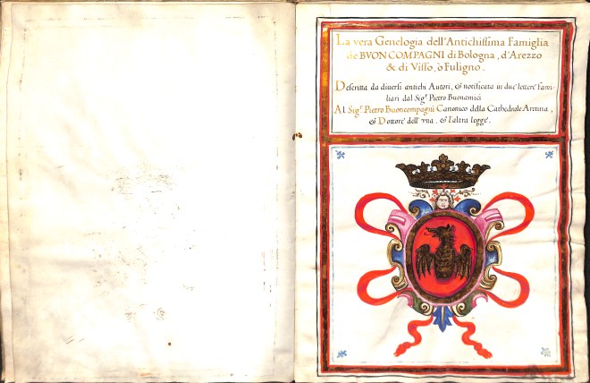From MS of Angelo Boncompagni, La vera Genelogia dell’Antichissima Famiglia de Buoncompagni di Bologna, d’Arezzo and di Visso ò Fuligno (1617). Collection of HSH Prince Nicolo’ and HSH Princess Rita Boncompagni Ludovisi, Rome.