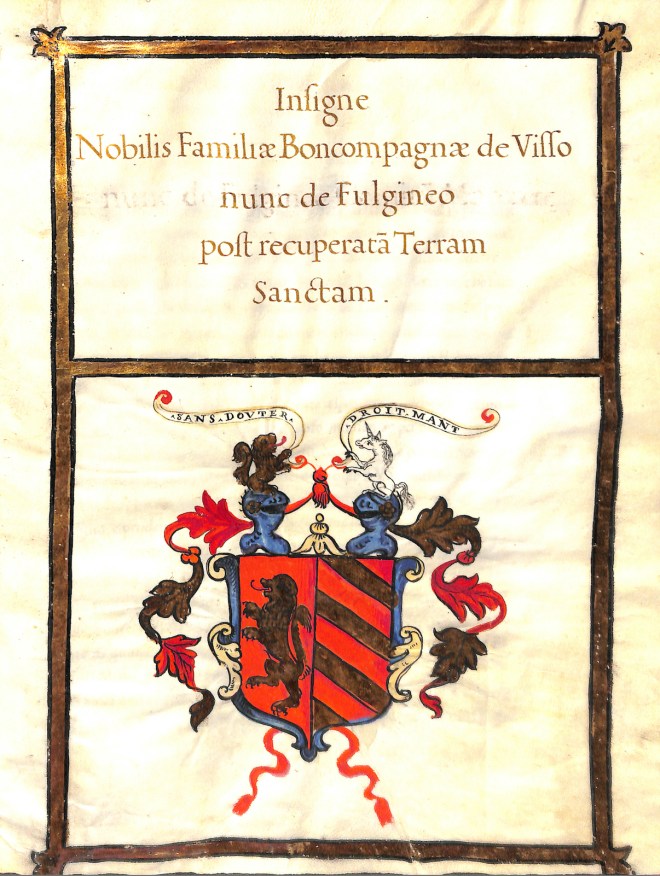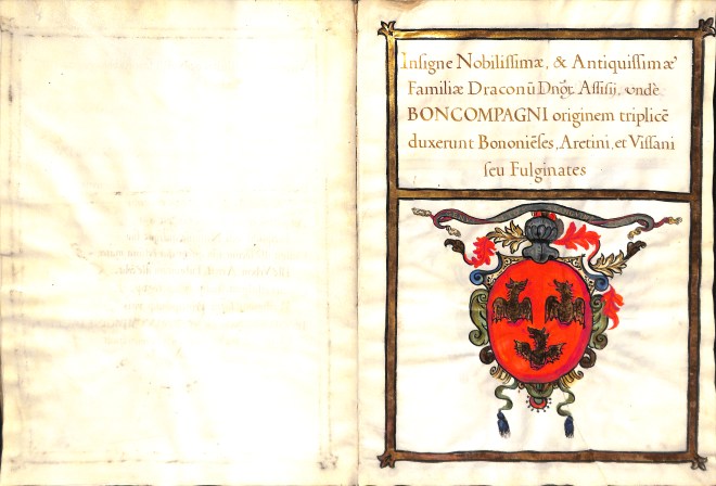 He continues: “a Boncompagno de Draconibus, leaving Assisi for the cities mentioned, and forced to remain in Visso, had a couple of sons there, one called Rinieri, the other Giovanni—one went to Bologna, got married there, and dropping the surname Draconibus, called himself Rinieri di Boncompagno, making his father’s surname his proper name. Giovanni, who also came from Arezzo, from whom [Pope Gregory’s family] descended, the one who remained in Visso did the same. In buying a title he made himself great, and from his branch, many have come. They still display today their ancient grants and imperial honors, in writings and crests.”