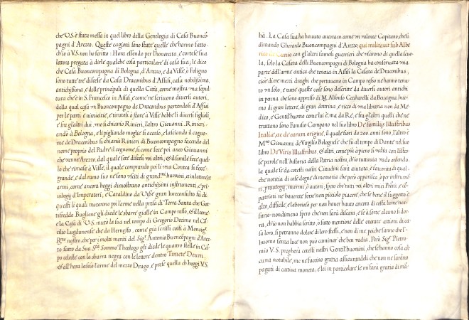 Buonamici addressed both of his letters transcribed here to Pietro Boncompagni, Canon of the Cathedral of Arezzo, and uncle of the book’s editor Angelo Boncompagni. Buonamici has nothing to say about Spoleto. Indeed, he seems most concerned to enhance the importance of the Arezzo branch of the family. In a letter dated 30 July 1577, Buonamici writes “…the House of Boncompagni of Bologna, of Arezzo, and of Visso or Foligno are all three descended from the House de Draconibus of Assisi, a most noble, ancient house, and from the leaders of that city, as a cemetery in St. Francis in Assisi shows, and as several authors write of the House.”