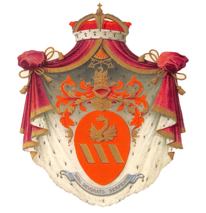 As followers of this blog know well, the heraldic crest of the Boncompagni Ludovisi—the union of two great Bolognese Papal families—consists of two principal elements. Representing the Ludovisi is a red field, and three bands of gold; and for the Boncompagni, also a red field, and a winged dragon of gold, with a truncated tail. Here and in the next two posts I will explore how the dragon came to be associated with the Boncompagni, and how that symbol was managed during the reign of Pope Gregory XIII Boncompagni (13 May 1572—10 April 1585).