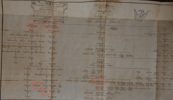 Giovanni Maria Bonetti, genealogical chart (detail) of the Boncompagni. Attached to MS Sommario de tutte le scritture attinenti all’ Ecc. Casa Boncompagni ritrovate nello Studio del Sig. Gio. Masini (1712). Collection of HSH Prince Nicolo’ and HSH Princess Rita Boncompagni Ludovisi, Rome. The red circle at right shows Ugo Boncompagni (= Pope Gregory XIII) and those at lower left the uncle and nephew Pietro Paolo and Angelo Boncompagni.