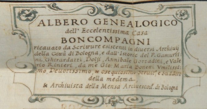 So we see Buonamici citing Fanusio Campano and Alfonso Ceccarelli. In 1712, when the archivist Giovanni Maria Bonetti drew up the Boncompagni family tree, he used Gamurrini but eschewed those sources.