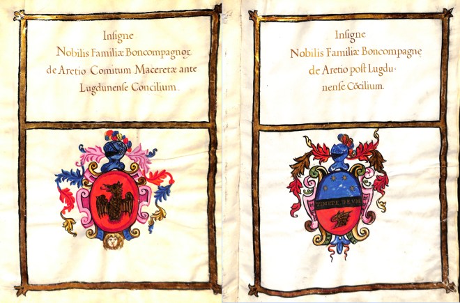 Buonamici then names his sources for the history of the Boncompagni family and its heraldry. “And all these things are described in writing by several authors who were following M. Alfonso Ceccharelli of Bevagna, a man of great literary ability, great interpretation, and rich with a library (not that of a doctor, being the gentleman that he is, but of a king.) Among others, those who deal with it are Fanusio Campano in his book De familiis Illustribus Italiae, ac de earum origine, which covers the better part of 200 years.”