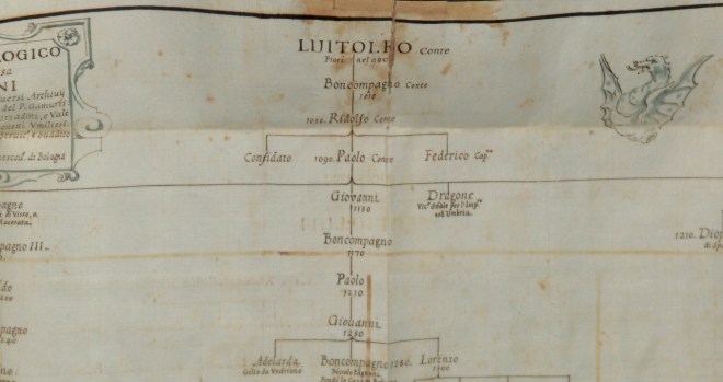 Bonetti for his genealogical chart cites several late 16th and 17th century sources, most prominently Eugenio Gamurrini, author of Discorso Genealogico della Famiglia Dragona Buoncompagna (1662) and Istoria genealogica delle famiglie nobili toscane, et vmbre I (1668) [with the Boncompagni discussed at 362-363 and 382-395]. It must be said that by Gamurrini’s time, Boncompagni genealogy had become a crowded field. Following upon the accession of Gregory XIII Boncompagni in 1572, a large number of writers and artists engaged in an investigation into Boncompagni family history—specifically how the Dragon von Saxon became the Boncompagni—and a new interpretation of the family symbol, the dragon.