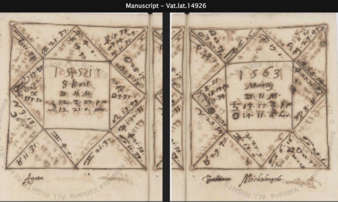 Screenshot of one of Ceccarelli’s horoscopes (in this case, for his contemporary Michelangelo) at https://digi.vatlib.it/view/MSS_Vat.lat.14926