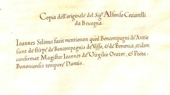 From MS of Angelo Boncompagni, La vera Genelogia dell’Antichissima Famiglia de Buoncompagni di Bologna, d’Arezzo and di Visso ò Fuligno (1617). Collection of HSH Prince Nicolo’ and HSH Princess Rita Boncompagni Ludovisi, Rome. Ceccarelli is quoted here as citing two sources on the Boncompagni of Arezzo, Ioannes Selinus and Ioannes de Virgilio (allegedly a contemporary of Dante). Both seem to be fabrications.