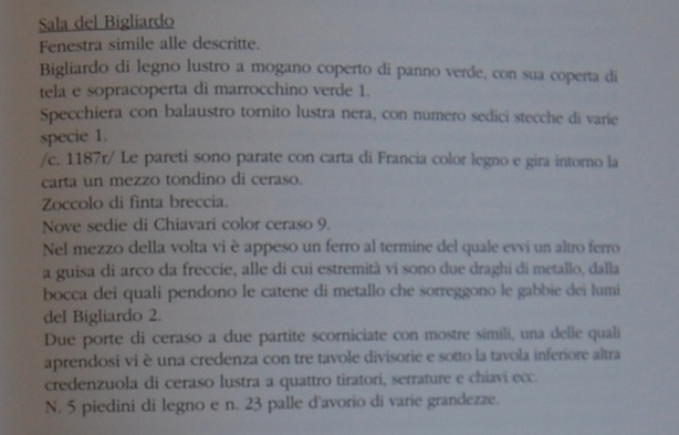 And what about this room’s later incarnation? For the 1872 inventory (see above), Anthony Majanlahti offers the following translation for the relevant bit about the ceiling: “In the middle of the vault [volta] there is hung an iron rod at the end of which there is another iron rod in the form of a bow [ie, a bow for arrows], at whose ends there are two metal dragons from the mouths of which hang the metal chains that support the two lampshades and lightbulbs over the billiard table”. Majanlahti adds: “volta” here seems to mean “vault” but might more generically mean “ceiling”, used rather laxly as a synonym for “soffitto“.