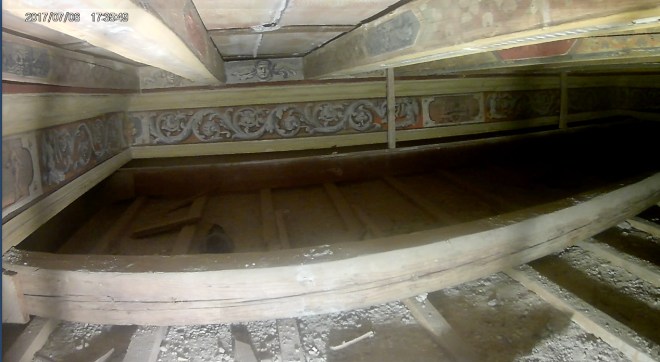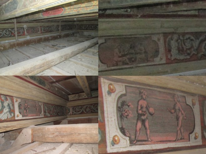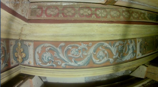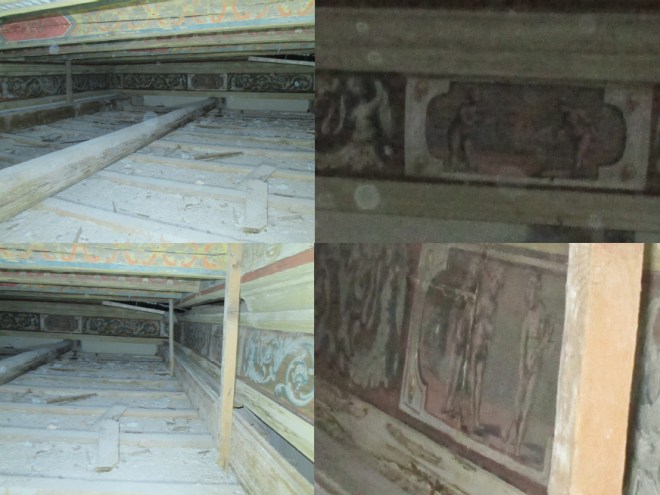 So what, if anything, can be seen of that “vault” in the ex-‘Sala del Letto’? On 5 and 7 July 2017 Princess Rita Boncompagni Ludovisi and Corey Brennan were able to feed a small GoPro video camera through a preexisting hole in the (high: 4.35m = 14′ 3″) modern plaster ceiling of one of the two relevant rooms, and take some images of a portion of the original upper walls and ceiling beams (which lay another meter above) in low-light conditions.