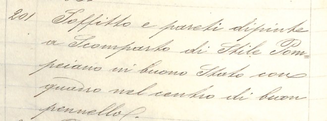 And for the 1908 inventory, Majanlahti translates: “Ceiling and walls painted in coffers, in Pompeian style in good condition with a well-painted picture in the centre”. He continues, “the ‘Pompeian style’ can be read here merely as grotteschi, i.e., an imitation of ancient Roman painting widespread in the sixteenth century and afterward, rather than what we know as the ‘Pompeian style’, of eighteenth-century origin. The big question in this inventory is what ‘quadro‘ means in this context. I would argue that if the ceiling is *not* vaulted, but coffered, then we can imagine that there was a painting (‘quadro‘) inserted into the ceiling, painted on something flat, like a wood panel or (more likely, for Guercino) a canvas.”