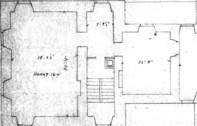 Plan (mid-1890s) of the southeastern portion of the piano nobile of the Casino Aurora, before division of the main elements into smaller units. From left, ‘Sala da pranzo’, decorated by Pietro Gagliardi, and transitional room (each constructed 1855-1858); and at right, the ex-‘Sala del Letto’ (part of the original Villa Aurora, and so constructed ca. 1570). Measurements in feet. Credit: Archives of American Art