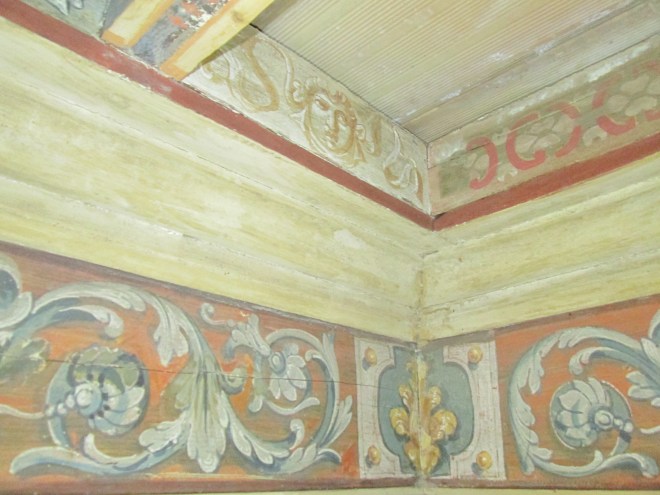What came into view was an extensive, intricate and highly colorful decorative scheme—and a 20th century intervention that covered the ceiling proper with corrugated boards. No vault is visible, or indeed anything beyond the corrugated boards. So the supposed Guercino ‘Satyr’ remains a mystery, for now. The relevant cultural authorities have been notified, and it will be task of conservators to undertake future work on this space.