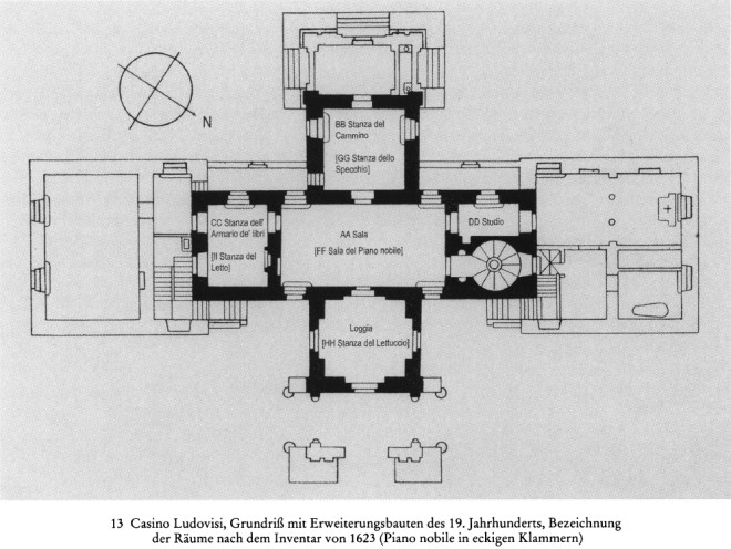 Plan of original core of the Villa Aurora (ground floor and piano nobile), with ‘Stanza del Letto’ at left. From Eva-Bettina Krems, “Die ‘magnifica modestia’ der Ludovisi auf dem Monte Pincio in Rom”, Marburger Jahrbuch für Kunstwissenschaft 29 (2002) 105-163, at 126