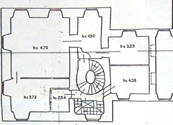 Plan (21st c.) of SE wing of Villa Aurora, showing modern subdivisions of units. The ex-‘Stanza del Letto’ is at right, divided into halves, with two different levels of drop ceiling. Measurements in meters. Image courtesy of HSH Prince Nicolò and HSH Princess Rita Boncompagni Ludovisi
