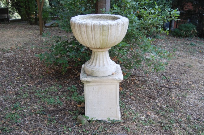 The Petronia Rufina monument / fluted vase ensemble as it appeared in August 2013, with base partially submerged. Below, detail of the final five lines of the inscription. Collection of †HSH Prince Nicolò and HSH Princess Rita Boncompagni Ludovisi, Rome.