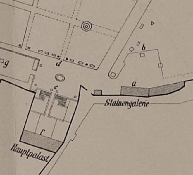 Map (detail) of the south-central portion of the Villa Ludovisi, showing location of the ‘Palazzino Capponi’ = Statuengalerie, in relation to the ‘Palazzo Grande’ = Hauptpalast. From T. Schreiber, Die Antiken Bildwerke Der Villa Ludovisi in Rom (1880).
