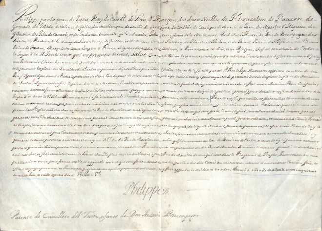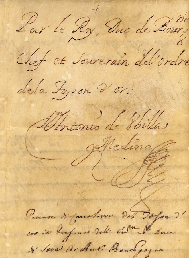 Detail of patent (25 June 1702) signed by King Philip V of Spain, directing that Antonio Boncompagni be inducted into the Order of the Golden Fleece = Archivio Boncompagni Ludovisi Prot. 588 No. 37. Credit: HSH Prince Nicolò and HSH Princess Rita Boncompagni Ludovisi Archive, Villa Aurora, Rome