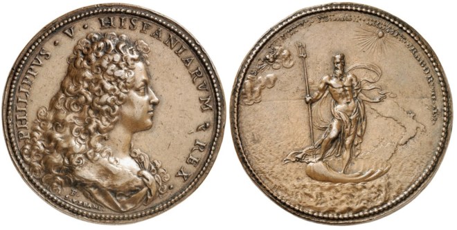 Philip V of Spain, copper Proclamation Medal (1702) by Ferdinand de St Urbain. On the reverse, Neptune stands in shell holding trident, behind him a map of Italy, with legend above SIC CVNCTVS PELAGI CECIDIT FRAGOR (= Verg. Aen. 5.821, “thus all the raging tumult of the sea subsides”). Image credit: Fritz Rudolf Künker GmbH & Co. KG, Auction 282 Lot 4469 (28 Sep 2016).