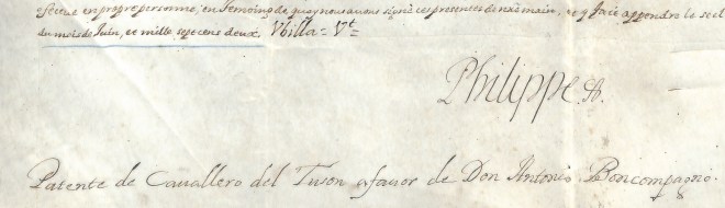 Detail of Patent (25 June 1702) signed by King Philip V of Spain, directing that Antonio Boncompagni be inducted into the Order of the Golden Fleece = Archivio Boncompagni Ludovisi Prot. 588 No. 37. Credit: HSH Prince Nicolò and HSH Princess Rita Boncompagni Ludovisi Archive, Villa Aurora, Rome