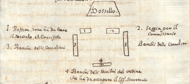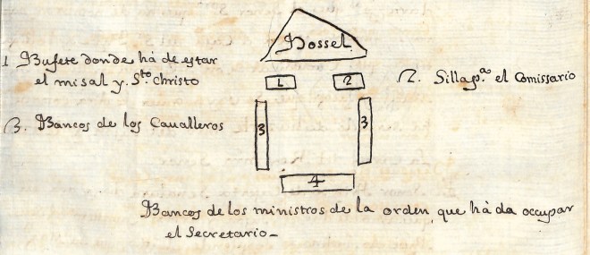 There must be a canopy at the front of it, and underneath [2] a sideboard where an open Missal must be placed over a pillow, and on top a small crucifix to do the Oath, and to the side of the sideboard a chair for His Excellency Prince of Caserta, and other covered satin benches with benches of tapestry or velvet for the Knights (even if they may not be present) to maintain the form of the Assembly; and the aforementioned His Lordship the Secretary, establishing the room well decorated, and the floor assembled in the way that is hereby delineated: