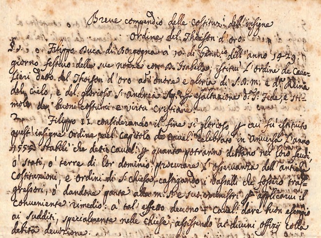 First paragraph of “Instruction” (original Spanish version) for the knighting of Francesco Caracciolo, Prince of Avellino, in the Order of the Golden Fleece. ABL Prot. 588 No. 37. Credit: HSH Prince Nicolò and HSH Princess Rita Boncompagni Ludovisi Archive, Villa Aurora, Rome