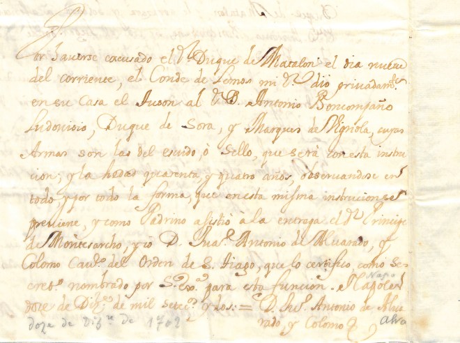 The 1702 document differs most significantly from its 1694 template in its last page. There the author, the royal secretary Antonio de Villa y Medina, states his titles and dates the instructions that are “sealed with the secret that is in my power.” He also adds that the Duke of Matalon is excused from the ceremony as of 9 June 1702. Instead, the Count of Lemos (= Fernando de Castro Portugal (1666-1742, Knight since 1692) would award the decoration of the Golden Fleece to Antonio Boncompagni. In a later addition to the same page, a second authority certifies that the ceremony was conducted properly, citing two witnesses—the Prince of Montesarchio, Andrea d’ Avalos (1618-1709, newly inducted as a Knight in 1702), and himself, Don Juan Antonio de Alvarado y Colomo, Knight of the Order of St Blaise, and then serving in Naples as secretary of the Count of Lemos (and conceivably as Groom of the Commissioner in the ceremony). The date is given as 12 December 1702—quite late in the year, and almost six months after the King had initially granted the honor to Boncompagni.