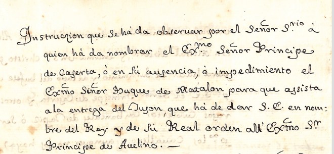 “[1] Instruction that should be observed for His Lordship the Secretary who must be appointed, the Illustrious Prince of Caserta—or in his absence, or hindrance, the Illustrious Duke of Matalón—so that he attend the award ceremony of the Golden Fleece, that must be given by His Excellency in the name of the King and his Royal Order to the Illustrious Prince of Avellino.
