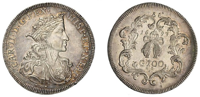 Charles II of Spain, Ducato of 100 Grani, Kingdom of Naples and the Two Sicilies, 1693, with emblem of the Golden Fleece centered on reverse. Credit: Numismatica Varesi, Auction 69—Part 2, Lot 603, 7 Oct 2016.