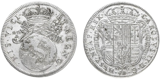 Charles II of Spain, Tarì 1684, Naples mint. Obverse: globe surmounted by crossed cornucopia and fasces; reverse: royal coat of arms encircled by collar of Order of the Golden Fleece. Credit: Bolaffi, Auction 32 Lot 794 (31 May 2018).