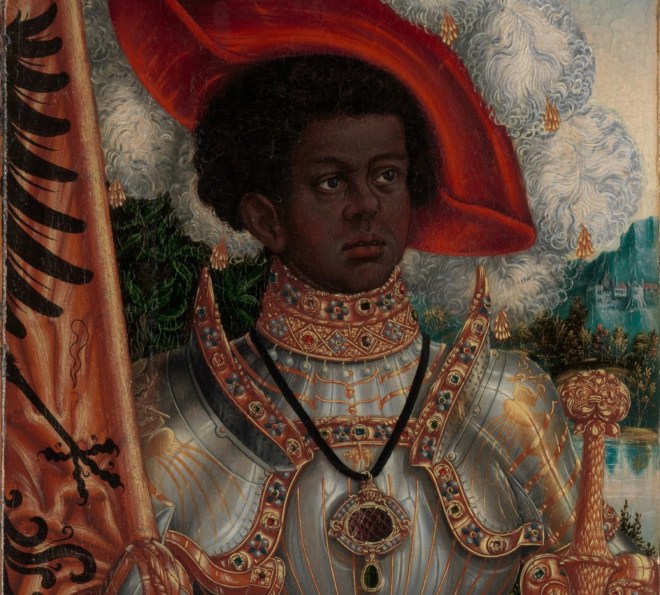 Lucas Cranach the Elder & Workshop (ca. 1520-1525), St Maurice. Though an early Christian martyr, he is portrayed wearing the collar of the Order of the Golden Fleece, a reference to Charles V, reigning as Holy Roman Emperor when this work was executed. Credit: https://www.metmuseum.org/art/collection/search/439081