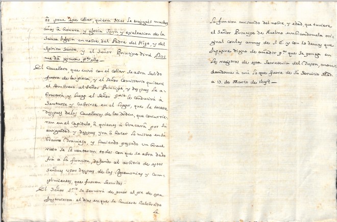His Lordship the Secretary will have the necessity of putting at the end of this Instruction: the day on which this function is celebrated, the name and age that the Prince of Avellino will have, [11] and sending the original Instruction to me with the arms of His Excellency and with the other (men) he will judge worthy of adding so that it is put in the records of this secretary of the Golden Fleece, commanding me all that which should be of the Majesty the Prince’s service.”
