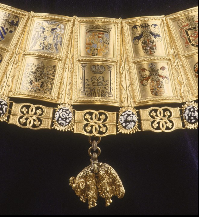 After this is completed, a chosen servant will carry the necklace of the Golden Fleece on a pillow or platter and hand it over to the Prince. The Lord Commissioner receives the Prince and the necklace, saying “may God grant that many years bring him to His honor, and His glory, and exaltation of the holy Church in the name of the Father, the Son, and of the Holy Spirit,” to which the Prince responds, “may God give me grace for it.” Finally, the Lord Commissioner removes the Prince’s hat and embraces him, and the Lord Secretary leads him to his seat.