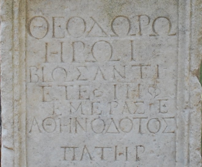 There are no reasons given in the epitaph for Theodoros’ demise, whether from warfare, illness, or accident. There is no specific mention of the literary, rhetorical, or military achievement of Theodoros, son of Athenodotos, nor is there documentation of a marriage. Yet his death must be significant to warrant the title “hero” and afford a funerary monument. He was rather young, having reached the cusp of young adulthood at 18 years and five days old.