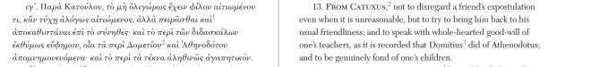“From Catulus: not to disregard a friend who blames you, even if he happens to blame an act unreasonably, but to try to re-establish him to his usual self; and [to speak] wholeheartedly fair-sounding words of teachers, as is remembered of Domitius [Balbus, a Stoic philosopher] and Athenodotos. And to [be] truly affectionate concerning children.”