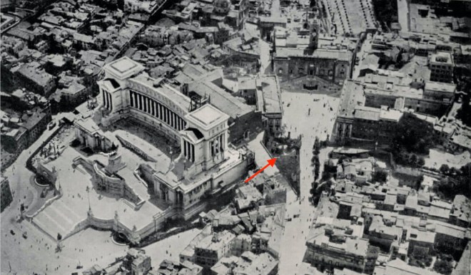 View of Campidoglio in 1929., with arrow indicating area of animal cages to left of Michelangelo’s stairs. From Antonio Muñoz, Roma di Mussolini (1935) p66