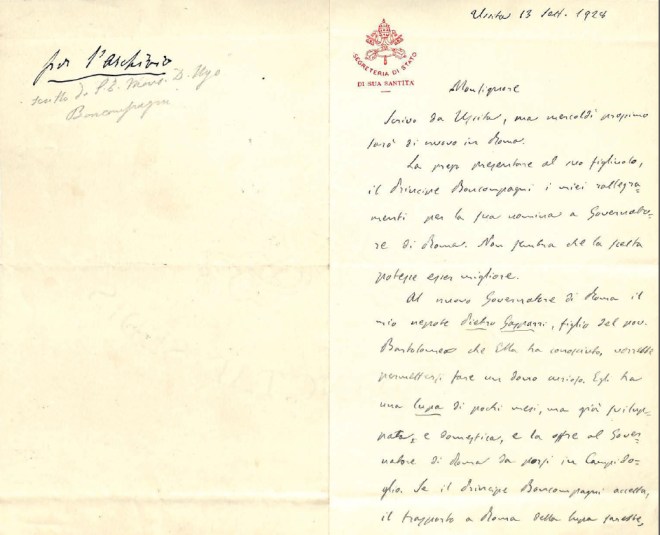 So the relationship between Ugo Boncompagni Ludovisi and his son Francesco illustrates a quiet back-channel of communication between the Vatican and Italy that we can see here was used to facilitate negotiations between the two powers. The letter from Gasparri is therefore likely a prime example of what was occurring behind the scenes in terms of “soft diplomacy” after Francesco Boncompagni Ludovisi’s appointment to Governor, and there were probably several other communications similar to this one that would help to smooth over tensions.