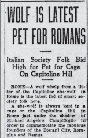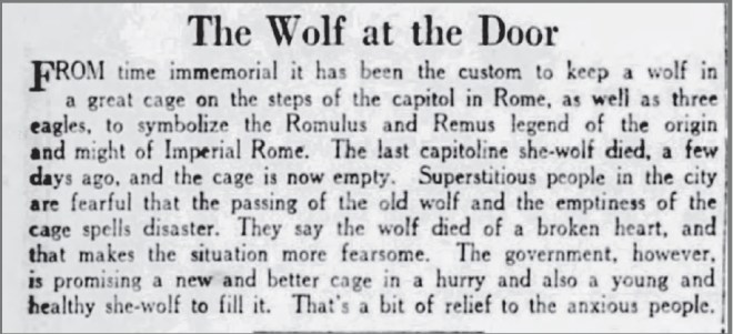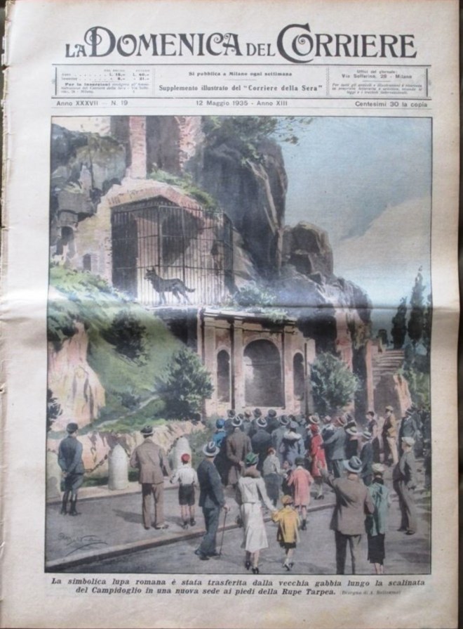 One of the traditions which Benito Mussolini emphasized greatly during his time as Prime Minister of Italy (1922-1943) was the Roman symbol of the Capitoline Wolf, whose long history as an icon is the subject of a full-length study (2010) by Cristina Mazzoni. An important facet of this emphasis was a live wolf—or rather a series of wolves—which since the early 1870s had been caged and put on display in the very center of Rome.