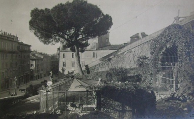The “living wolf” inside her enclosure on the Campidogli from (above) L’Illustrazione Italiana no. 49 December 1902; (below) postcard (ca. 1910). In May 1931, the massive umbrella pine pictured in the lower image toppled over and almost crushed both cages and their inhabitants together.