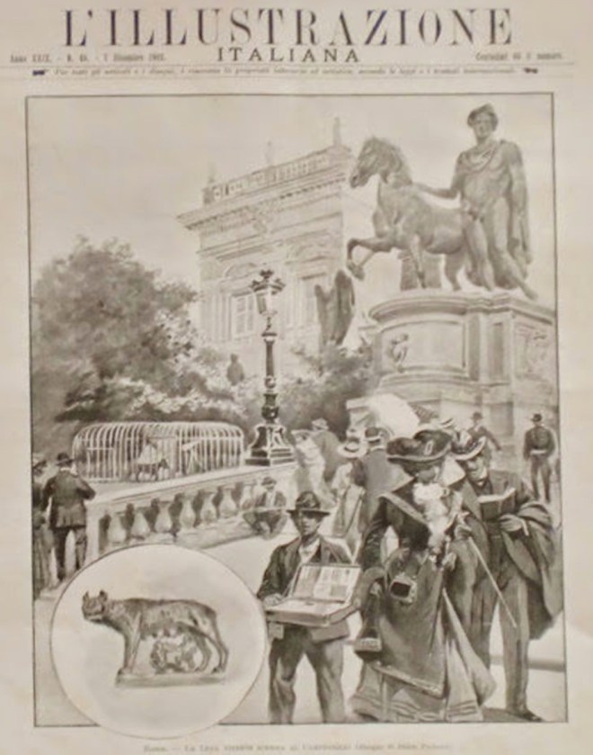 Even British and American newspapers reported on the caged wolf, first on its establishment on the Campidoglio, and later various lupine events as they happened. These included an escape (already in January 1873), an attempted theft, a long series of reproductions—male wolves would periodically be brought in to mate with the she-wolf to produce a new generation of wolves—and replacements for the animals that became too old to be caged or died. Indeed, By the time of Mussolini’s regime, a superstition evidently had taken hold that to leave the wolf cage empty was ill-omened for the city.