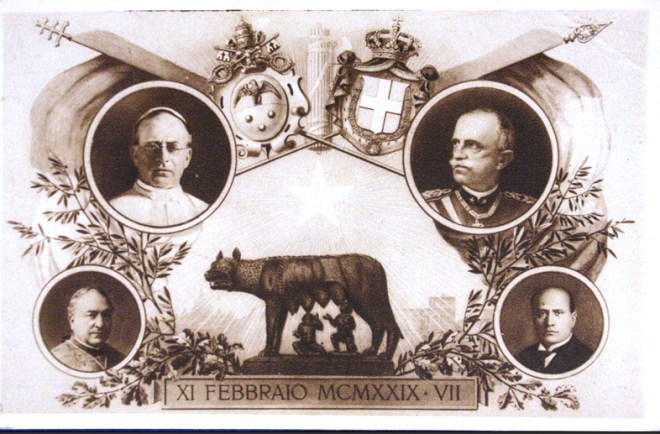 Postcard commemorating (from the Italian perspective) the Lateran Pacts of 11 February 1929. Pictured, clockwise from lower left: Cardinal Pietro Gasparri, Pope Pius XI, King Vittorio Emanuele III, and Benito Mussolini. At lower center, the Capitoline Wolf.