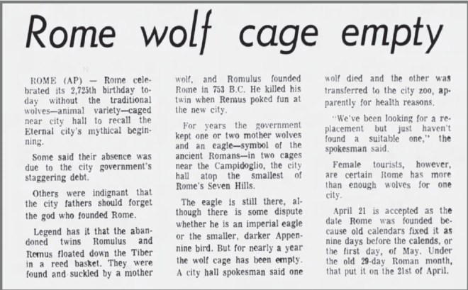 This news coverage continued for decades, and articles about the caged Roman wolf appeared sporadically all the way through the early 1970s. The fact that these stories were printed at all, and continued to be printed, suggests that the stories were interesting to an international public despite their inconsequentiality. Clearly the live wolf served as a very effective reminder of Roman power and the eternal relevance of Rome.