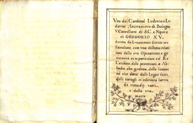 Title page of Lucantonio Giunti, MS biography of Cardinal Ludovico Ludovisi (ca. 1633). Collection †HSH Prince Nicolò and HSH Princess Rita Boncompagni Ludovisi, Casino Aurora, Rome.