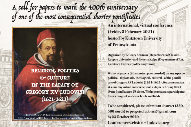 “Religion, Politics & Culture in the Papacy of Gregory XV Ludovisi (1621-1623)“, is organized by T. Corey Brennan (Department of Classics—Rutgers University; also director, Archivio Digitale Boncompagni Ludovisi) and Pierette Kulpa (Department of Art, Kutztown University of Pennsylvania). Conference website: ludovisi.org