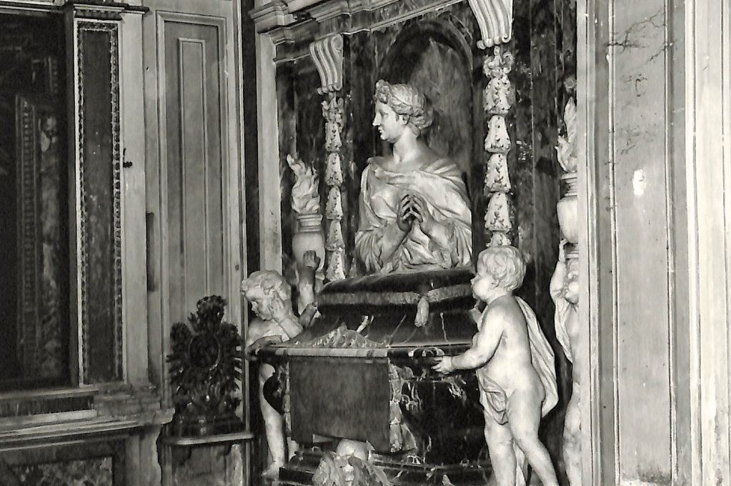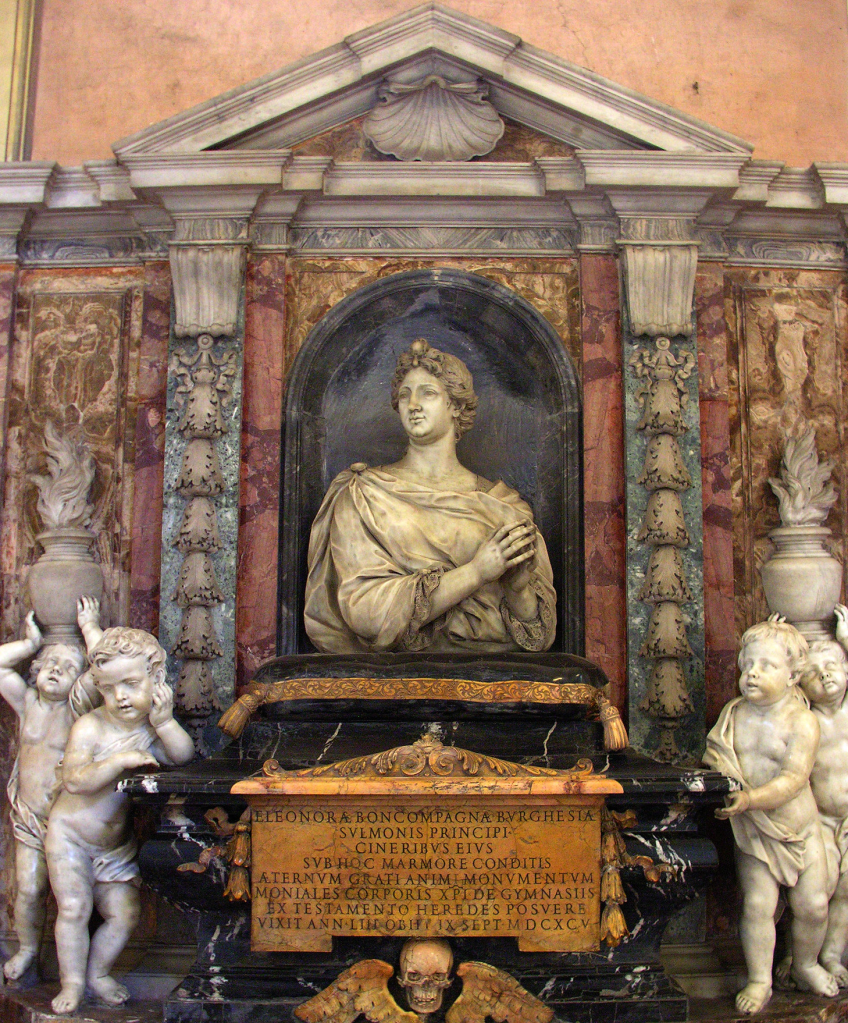 Eleonora died on 29 September 1695, at 53 years old, far from the Borghese palace. In her will, the Discalced Carmelite nuns of Corpus Domini—with their church of S Lucia dei Ginnasi on Via delle Botteghe Oscure— were named Eleonora’s principal heirs. Why? Perhaps because her husband’s grandmother, Camilla Orsini Borghese, had decamped to this convent, also against family wishes, almost 30 years previous, and taken religious vows. In her final will, Eleonora was explicit in her wish to be buried in the Carmelites’ church, and not the Borghese family chapel in the basilica of S Maria Maggiore. For their part, the nuns commissioned a magnificent tomb monument for their patron, executed in the church’s “Chapel of the Crucifix” by the architect Giovanni Battista Contini (a pupil of Bernini) and the sculptor Andrea Fucigna in the years 1702-1705.